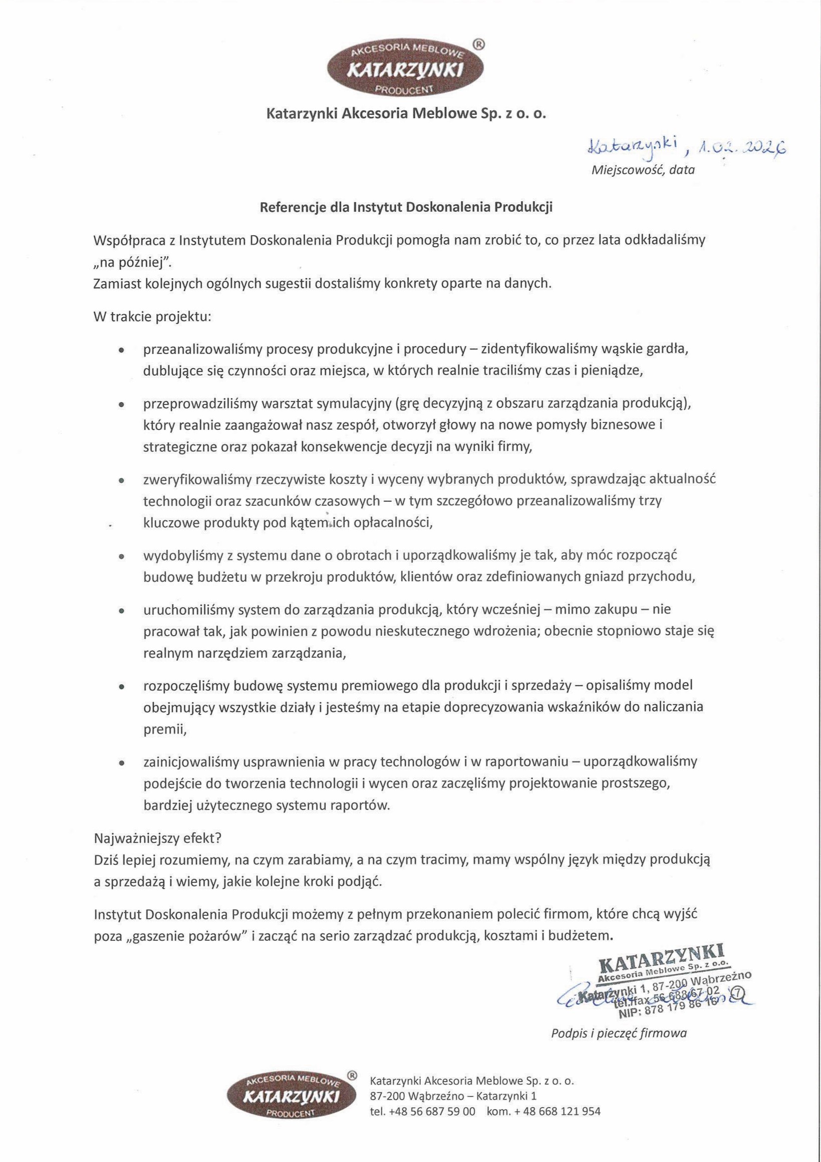 "Możemy wystawić dobre referencje dla Instytutu Doskonalenia Produkcji ze względu na: